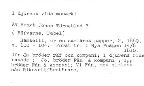 I djurens vida monarki //// Av Bengt Johan Törneblad ? ( Räfvarne, Fabel) //// Hamselli, ur en samlares papper, 2, 1869, s. 100 - 104.- Först tr. i Nya Posten 14/6 //// 1810. //// Jfr ja bröder räf och kompani; I djurens rike rasade ; Jo, bröder Fån & kompani ; Upp bröder Fån & kompani; Vi Fån, med himlens nåd Riksvettförstörare.