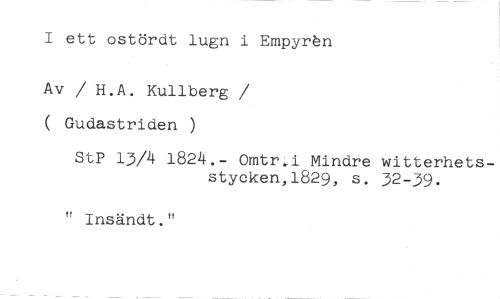 I ett ostördt lugn i Empyrbn //// Av / H.A. Kullberg / ( Gudastriden ) //// StP 13/4 1824.- Omtr.i Mindre witterhetsstycken,1829, s. 32-39. //// " Insändt."