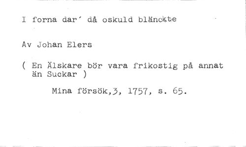 1 forna dar' då oskuld bläncitte Av Johan Elers //// ( En Älskare bör vara frikostig på annat än Suckar ) //// Mina försök,3, 1757, s. 65.