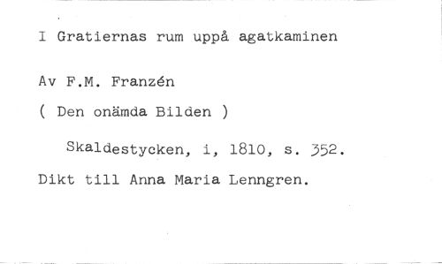 I Gratiernas rum uppå agatkaminen //// Av F.M. Franzén //// ( Den onämda Bilden ) //// Skaldestycken, i, 1810, s. 352. Dikt till Anna Maria Lenngren.