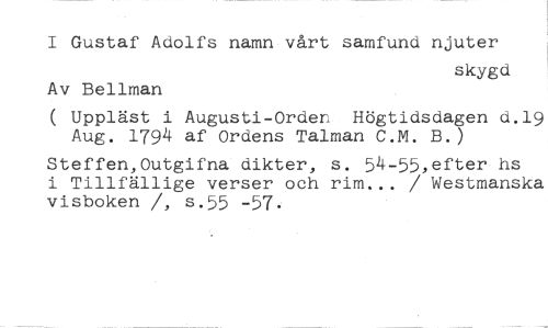 I Gustaf Adolfs namn vårt samfund njuter //// skygd //// Av Bellman //// ( Uppläst i Augusti-Ordern Högtidsdagen d.19 Aug. 1794 af Ordens Talman C.M. B.) //// Steffen,Outgifna dikter, s. 54-55,efter hs i Tillfällige verser och rim... / Westmanska visboken /, s.55 -57.
