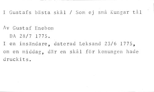 I Gustafs bästa skäl / Som ej små Kungar tål //// Av Gustaf Enebom //// DA 28/7 1775. //// I en insändare, daterad Leksand 23/6 1775, om en middag, där en skål för konungen hade druckits.