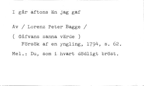 I går aftons än jag gaf Av / Lorenz Peter Bagge //// /( Gåfvans sanna värde ) //// Försök af en yngling, 1794, s. 62. //// Mel.: Du, som i.hvart dödligt bröst.