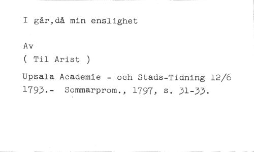 I går,då min enslighet //// Av //// ( Til Arist ) //// Upsala Academie - och Stads-Tidning 12/6 1793.- Sommarprom., 1797, s. 31-33.