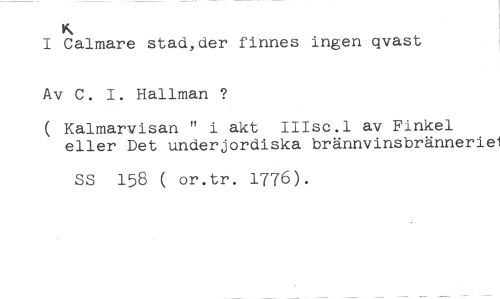 K //// I Calmare stad,der finnes ingen qvast //// Av C. I. Hallman ? //// ( Kalmarvisan " i akt IIIsc.l av Finkel eller Det underjordiska brännvinsbränneriel //// SS 158 ( or.tr. 1776).