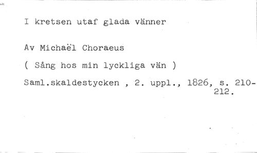 I kretsen utan glada vänner //// Av Michael Choraeus //// ( Sång hos min lyckliga vän ) //// Saml.skaldestycken , 2. uppl., 1826, s. 210- //// 212.