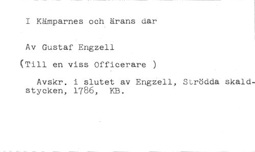 I Kämparnes och ärans dar //// Av Gustaf Engzell //// (Till en viss Officerare //// Avskr. i slutet av Engzell, Strödda skald-stycken, 1786, KB.