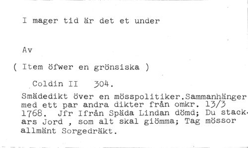 I mager tid är det et under //// Av //// ( Item öfwer en grönsiska ) //// Coldin II 304. //// Smädedikt över en mösspolitiker.Sammanhänger med ett par andra dikter från omkr. 13/3 1768. Jfr Ifrån Späda Lindan dömd; Du stack. ars Jord , som alt skal giömma; Tag mössor allmänt Sorgedräkt.