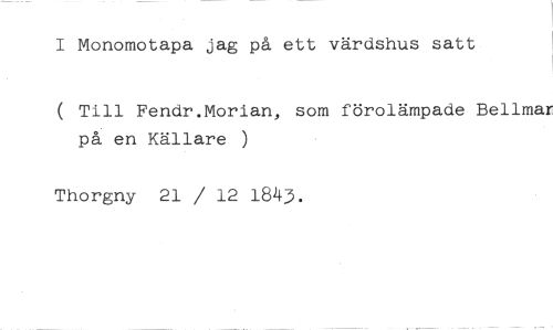 I Monomotapa jag på ett värdshus satt //// ( Till Fendr.Morian, som förolämpade Bellmar på en Källare ) //// Thorgny 21 / 12 1843.