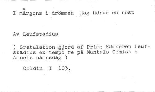 0 //// I mårgons i drömmen jag hörde en röst //// Av Leufstadius //// ( Gratulation gjord af Prim: Kämneren Leufstadius ex tempo re på Mantals Comiss : Amnels namnsdag ) //// Coldin I 103.