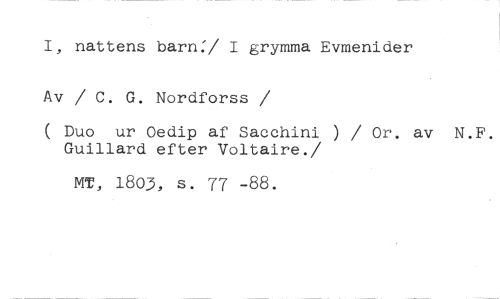 1, nattens barn:/ I grymma Evmenider Av / C. G. Nordforss //// /( Duo ur Oedip af Sacchini ) / Or. av N.F. Guillard efter Voltaire. //// /MT, 1803, s. 77 -88.