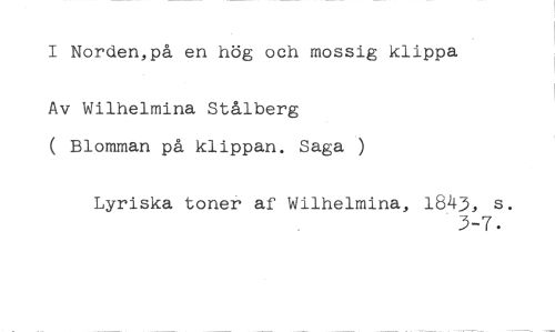 I Norden,på en hög och mossig klippa //// Av Wilhelmina Stålberg //// ( Blomman på klippan. Saga ) //// Lyriska toner af Wilhelmina, 1843, s. //// 3-7•