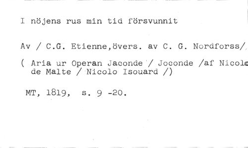 I nöjens rus min tid försvunnit //// Av / C.G. Etienne,övers. av C. G. Nordforss/. //// ( Aria ur Operan Jaconde / Joconde /af Nico1 de Malte / Nicolo Isouard /) //// MT, 1819, s. 9 -20.
