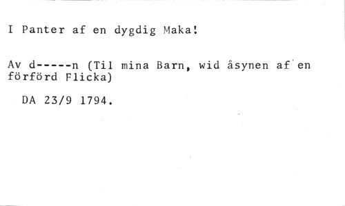 I Panter af en dygdig Maka! //// Av d n (Til mina Barn, wid åsynen af'en //// förförd Flicka) //// DA 23/9 1794.