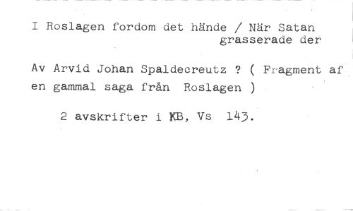 I Roslagen fordom det hände / När Satan //// grasserade det //// Av Arvid Johan Spaldecreutz ? ( Fragment af en gammal saga från Roslagen ) //// 2 avskrifter i KB, Vs 143.