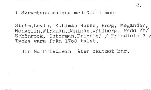 2. //// I Skrymtans masque med Gud i mun //// Ström,Levin, Kuhlman Hesse, Berg, Megander, Hongelin,Wirgman,Dahlman,Wåhlberg, Rådd /?/ Schönrock, Osterman,Friedlej / Friedlein ? / Tycks vara från 1760 talet. //// Jfr Nu Friedlein åter skutsat har.