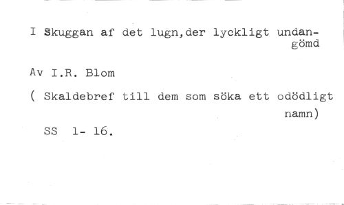 I Skuggan af det lugn,der lyckligt undan- //// gömd //// Av I.R. Blom //// ( Skaldebref till dem som söka ett odödligt //// namn) //// SS 1- 16.