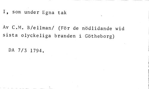 I, som under Egna tak //// Av C.M. B/ellman/ (För de nödlidande wid sista olyckeliga branden i Götheborg) //// DA 7/3 1794.