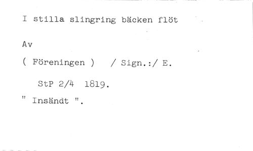 I stilla slingring bäcken flöt //// Av //// ( Föreningen ) / Sign.:/ E. //// StP 2/4 1819. 11 Insändt ".
