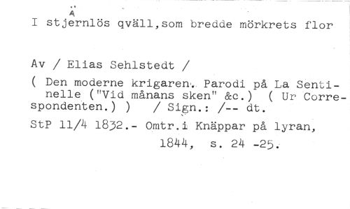 A //// I stjernlös qväll,som bredde mörkrets flor Av / Elias Sehlstedt //// /( Den moderne krigaren, Parodi på La Sentinelle ("Vid månans sken" &c.) ( Ur Corre- //// spondenten.) ) / Sign.: dt. //// StP 11/4 1832.- Omtr.i Knäppar på lyran, //// 1844, s. 24 -25.