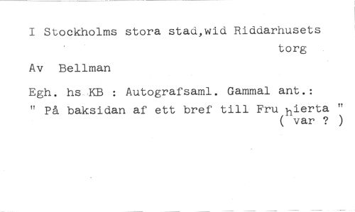 I Stockholms stora stad,wid Riddarhusets //// torg //// Av Bellman //// Egh. hs-KB Autografsaml. Gammal ant.: //// " På baksidan af ett bref till Fru hierta " //// ( var ? )