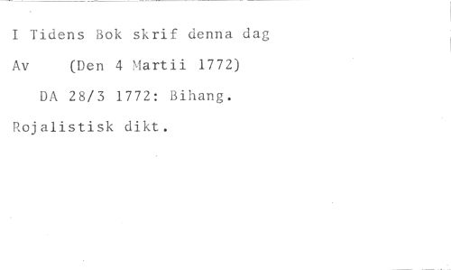 I Tidens Bok skrif denna dag //// Av (Den 4 Martii 1772) //// DA 28/3 1772: Bihang. Rojalistisk dikt.
