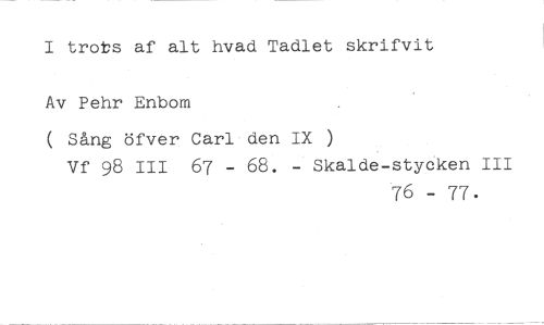 I trots af alt hvad Tadlet skrifvit Av Pehr Enbom //// ( Sång öfver Carl den IX ) //// Vf 98 III 67 - 68. - Skalde-stycken III //// 76 - 77.