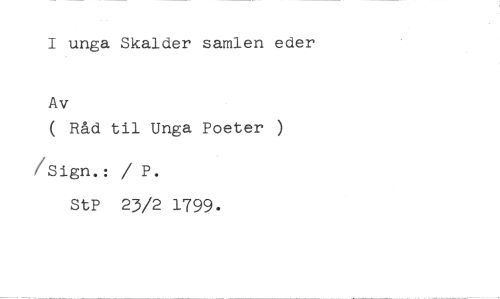 I unga Skalder samlen eder //// Av //// ( Råd til Unga Poeter //// /Sign.: / P. //// StP 23/2 1799.