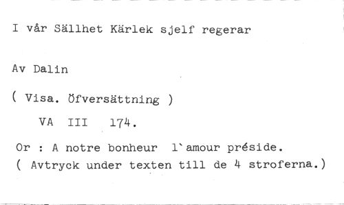 I vår Sällhet Kärlek sjelf regerar Av Dalin //// ( Visa. öfversättning ) VA III 174. //// Or : A notre bonheur 1'amour prside. //// ( Avtryck under texten till de 4 stroferna.)