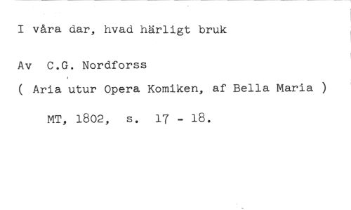 I våra dar, hvad härligt bruk //// Av C.G. Nordforss //// ( Aria utur Opera Komiken, af Bella Maria ) //// MT, 1802, s. 17 - 18.