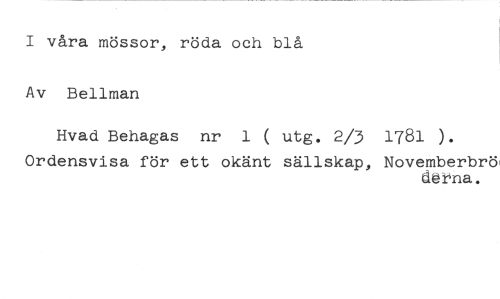 I våra mössor, röda och blå Av Bellman //// Hvad Behagas nr 1 ( utg. 2/3 1781 ). Ordensvisa för ett okänt sällskap, Novemberbröi //// Una.