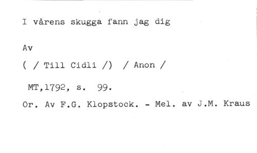 I vårens skugga fann jag dig //// Av //// ( / Till Cidli /) / Anon //// /MT,1792, s. 99. //// Or. Av F.G. Klopstock. - Mel. av J.M. Kraus