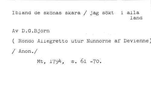 Ibland de skönas skara / jag sökt i alla //// lana //// Av D.G.Björn //// ( Rondo Allegretto utur Nunnorne af Devienne) / Anon. //// /Mt, 1794, s. 61 -7o.
