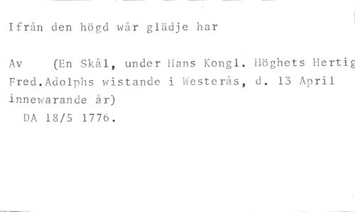 Ifrån den högd wår glädje har //// Av (En Skål, under Hans Kongl. Höghets Hertig //// Fred.Adolphs wistande i Westerås, d. 13 April innewarande år) //// DA 18/5 1776.
