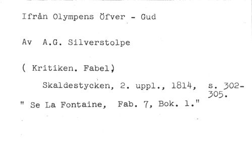 Ifrån Olympens öfver - Gud Av A.G. Silverstolpe Kritiken. Fabel) //// Skaldestycken, 2. uppl., 1814, s. 302- //// 305. //// rl Se La Fontaine, Fab. 7, Bok. 1."