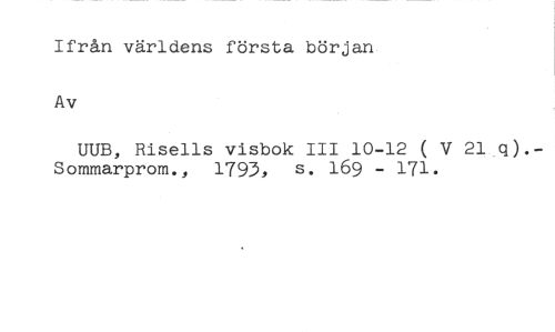 Ifrån världens första början Av //// UUB, Risells visbok III 10-12 ( V 21 q).- Sommarprom., 1793, s. 169 - 171.