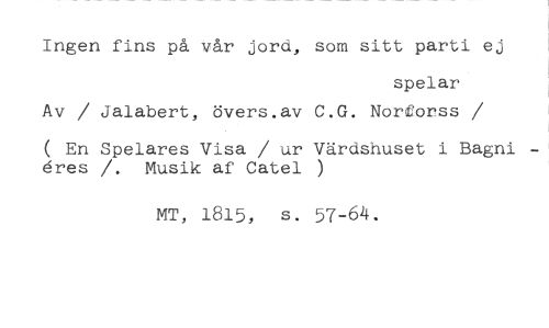 Ingen fins på vår jord, som sitt parti ej //// spelar //// Av / Jalabert, övers.av C.G. Norforss //// /( En Spelares Visa / ur Värdshuset i Bagni - eres /. Musik af Catel ) //// MT, 1815, s. 57-64.
