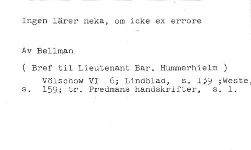 Ingen lärer neka, om icke ex errore //// Av Bellman //// ( Bref til Lieutenant Bar. Hummerhielm ) //// Völschow VI 6; Lindblad, s. l 9 ;Weste, s. 159;'tr. Fredmans handskrifter, s. 1.