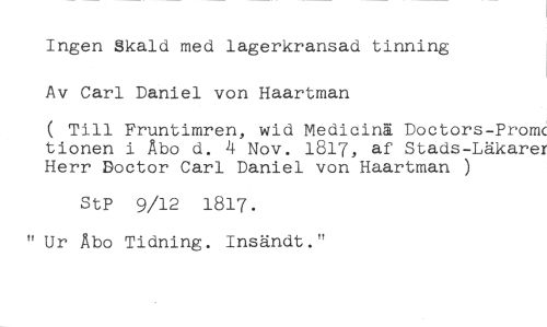 Ingen Skald med lagerkransad tinning Av Carl Daniel von Haartman //// ( Till Fruntimren, wid Medicinä Doctors-Prom tionen i Åbo d. 4 Nov. 1817, af Stads-Läkarer Herr Doctor Carl Daniel von Haartman ) //// StP 9/12 1817. //// Ur Åbo Tidning. Insändt."