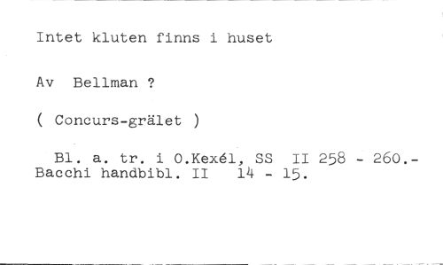 Intet kluten finns i huset //// Av Bellman ? //// ( Coneurs-grälet ) //// Bl. a. tr. i 0.KexAl, SS II 258 - 260.- //// Bacchi handbibl. II 14 - 15.