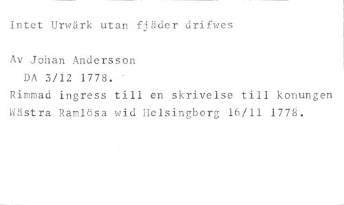 Intet Urwärk utan fjäder drifwes //// Av Johan Andersson //// DA 3/12 1778. //// Rimmad ingress till en skrivelse till konungen Wästra Ramlösa wid Helsingborg 16/11 1778.