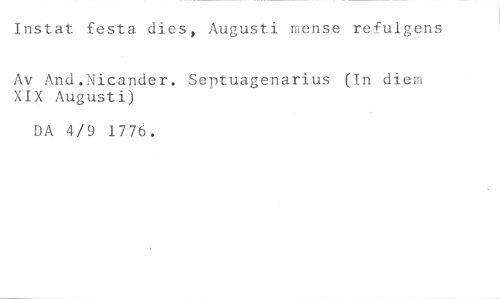 Instat festa dies, Augusti mense refulgens //// Av And.Nicander. Septuagenarius (In diem XIX Augusti) //// DA 4/9 1776.