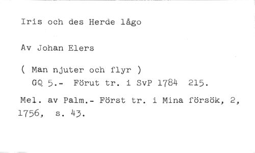 Iris och des Herde lågo Av Johan Elers //// ( Man njuter och flyr ) //// GQ 5.- Förut tr. i SvP 1784 215. //// Mel. av Palm.- Först tr. i Mina försök, 2, 1756, s. 43.