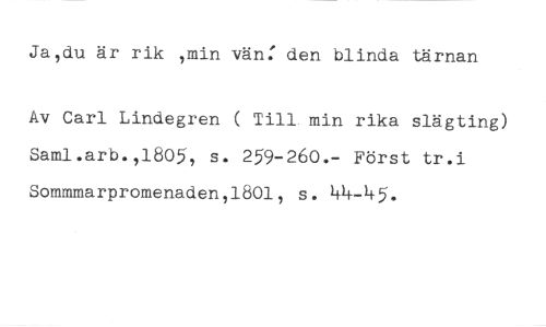 Ja5du är rik ,min vän: den blinda tärnan //// Av Carl Lindegren ( Till min rika slägting) Saml.arb.,1805, s. 259-260.- Först tr.i Sommarpromenaden,1801, s. 44-45.