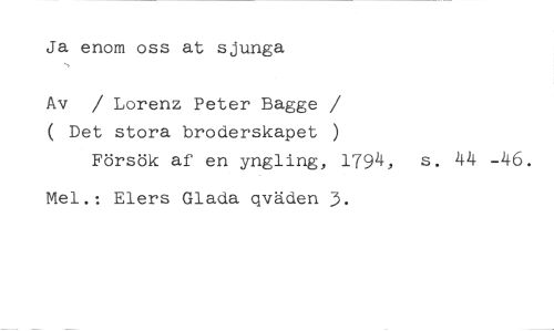 Ja enom oss at sjunga //// Av / Lorenz Peter Bagge / ( Det stora broderskapet ) //// Försök af en yngling, 1794, s. 44 -46. //// Mel.: Elers Glada qväden 3.