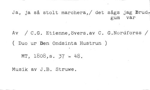 Ja, ja så stolt marchera,/ det sågs jag Brudl //// gum var //// Av / C.G. Etienne,övers.av C. G.Nordforss / ( Duo ur Den Ondsinta Hustrun ) //// MT, 1808,s. 37 48. //// Musik av J.B. Struwe.