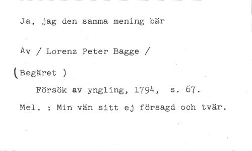 Ja, jag den samma mening bär Av / Lorenz Peter Bagge //// /tBegäret ) //// Försök av yngling, 1794, s. 67. //// Mel. : Min vän sitt ej försagd och tvär.