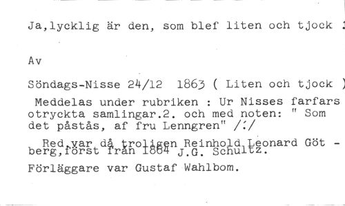 Ja,lycklig är den, som blef liten och tjock //// Av //// Söndags-Nisse 24/12 1863 ( Liten och tjock //// Meddelas under rubriken : Ur Nisses farfars otryckta samlingar.2. och med noten: " Som det påstås, af fru Lenngren" /: //// /Red var då troligen Reinhold Leonard Göt - berg,forst rran iöom. J.G. Schultz. //// Förläggare var Gustaf Wahlbom.