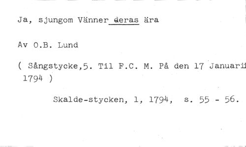 Ja, sjungom Vänner deras ära Av O.B. Lund //// ( Sångstycke,5. Til F.C. M. På den 17 Januarij 1794 ) //// Skalde-stycken, 1, 1794, s. 55 - 56.