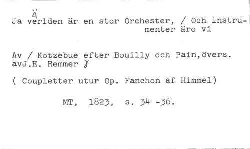 Ja vet^ //// rlden är en stor Orchester, / Och instru- //// menter äro vi //// Av / Kotzebue efter Bouilly och Pain,övers. avJ.E. Remmer % //// ( Coupletter utur Op. Fanchon af Himmel) MT, 1823, s. 34 -36.